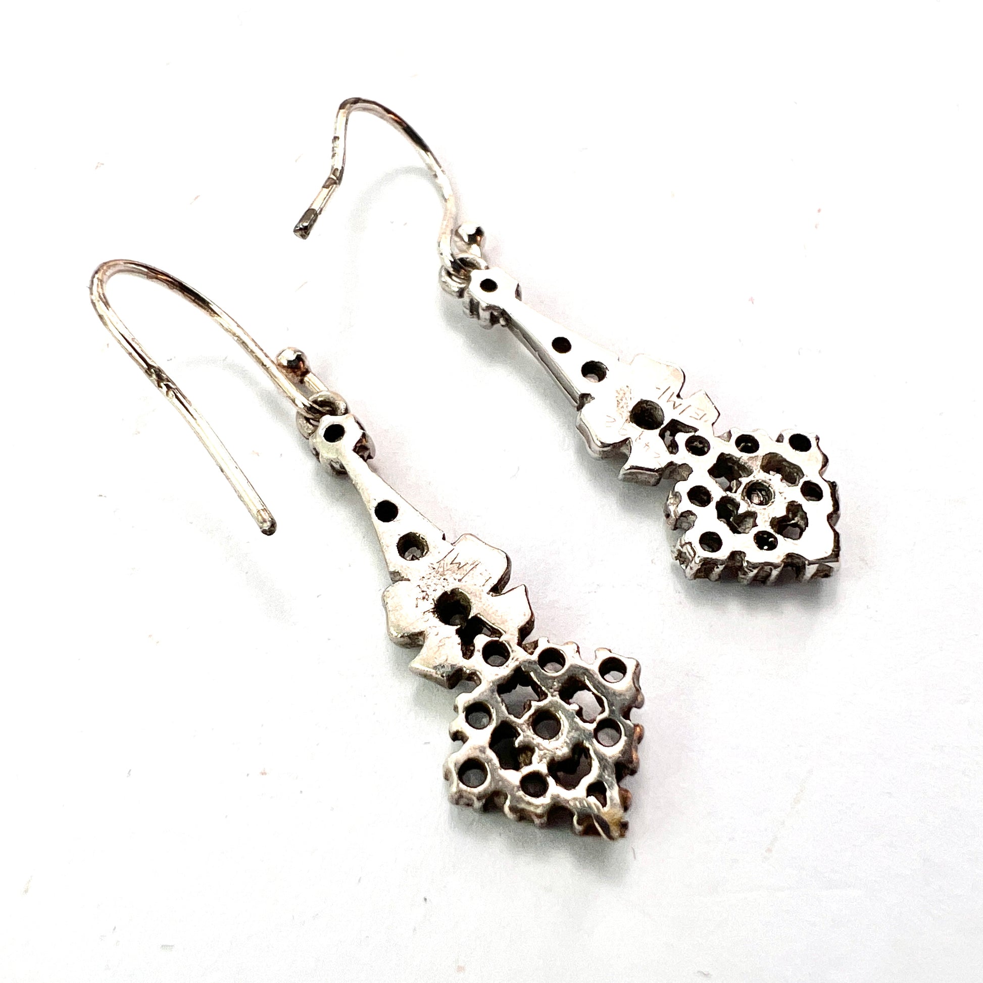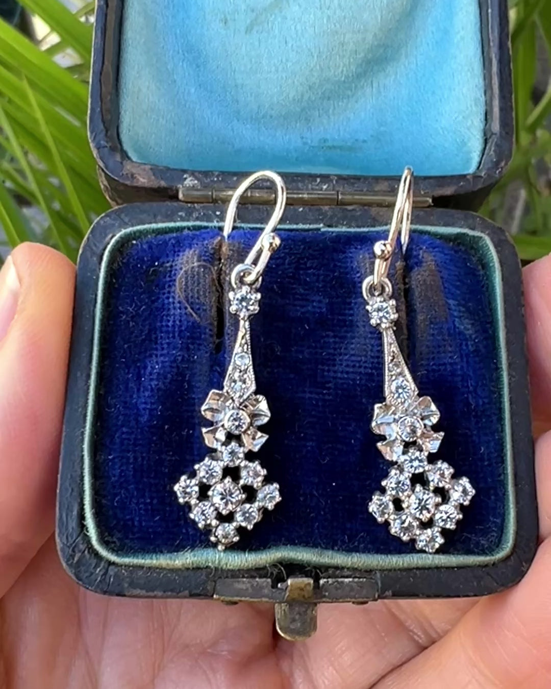 • Hallmarks/stamps: None (likely lost when the tops were converted), the earrings and wires test as sterling silver.