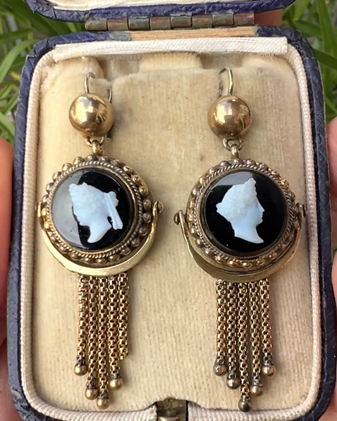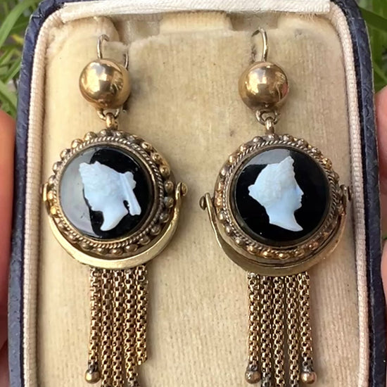 A wonderful pair of gilt Victorian cameo earrings with classical portraits in hardstone above five dangling foxtail chains. It's a nice sign of quality when the cameo heads face opposite directions and have different features.
