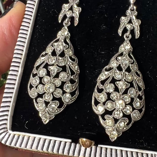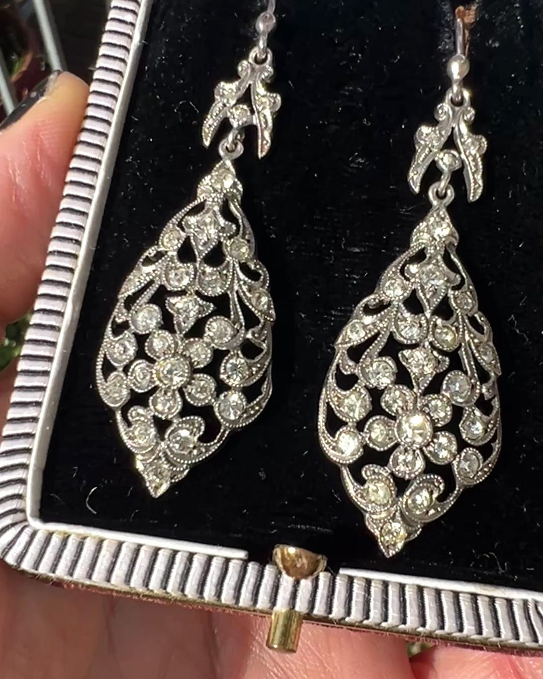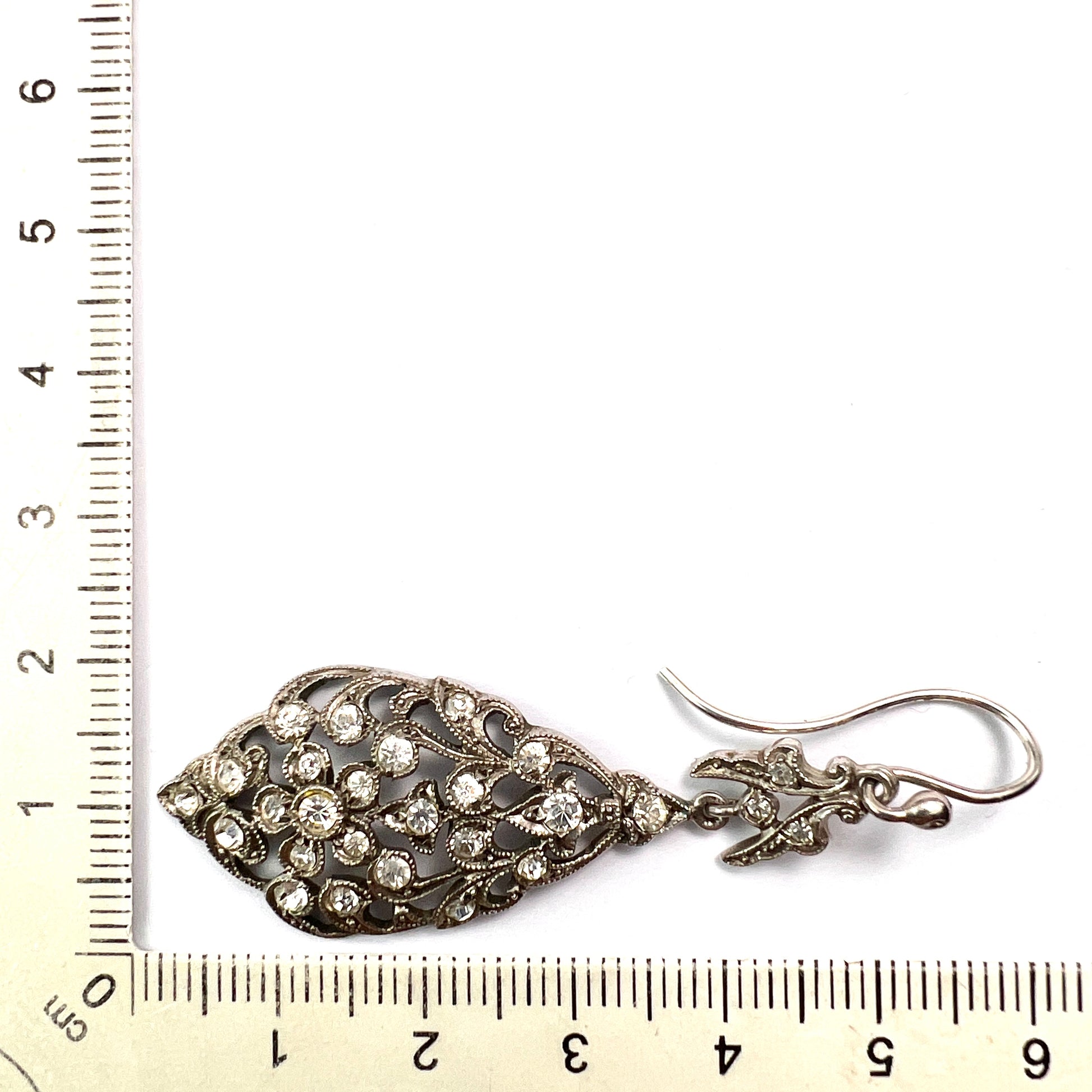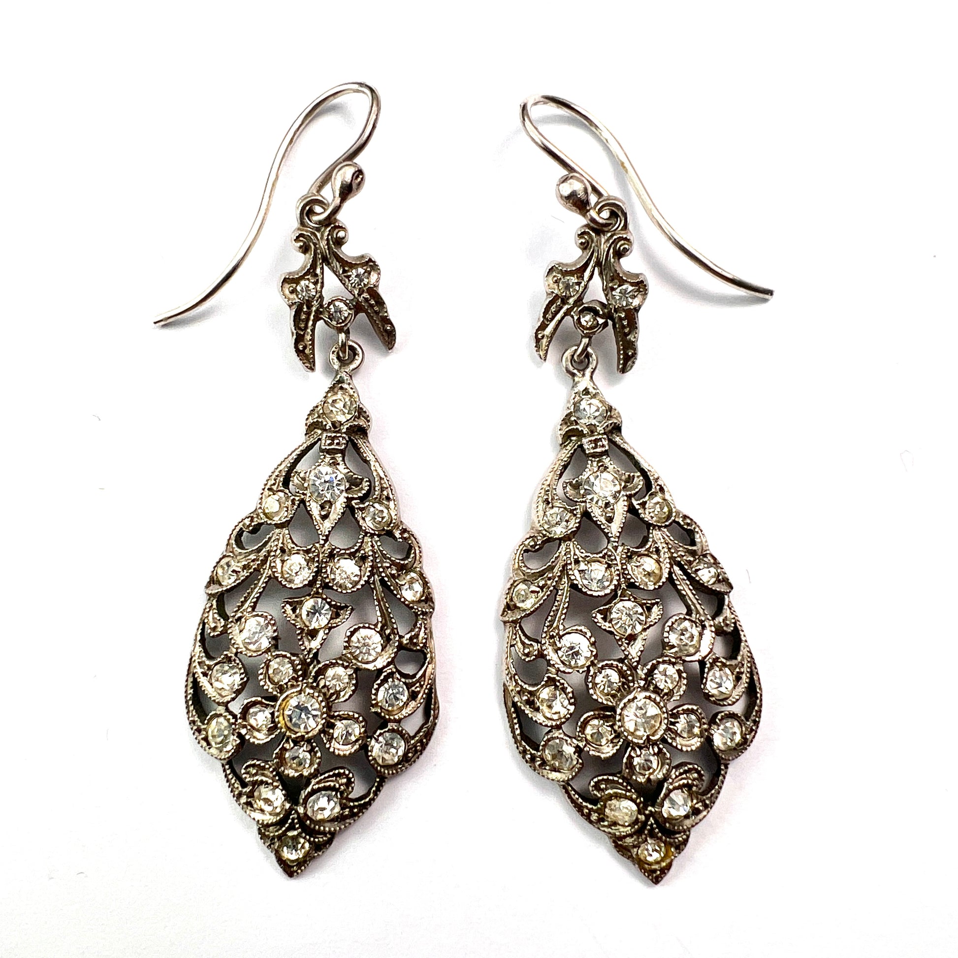 Romantic antique silver earrings studded with twinkling foil-backed pastes in pretty milgrain-edged settings arranged in a scrolling floral pattern.