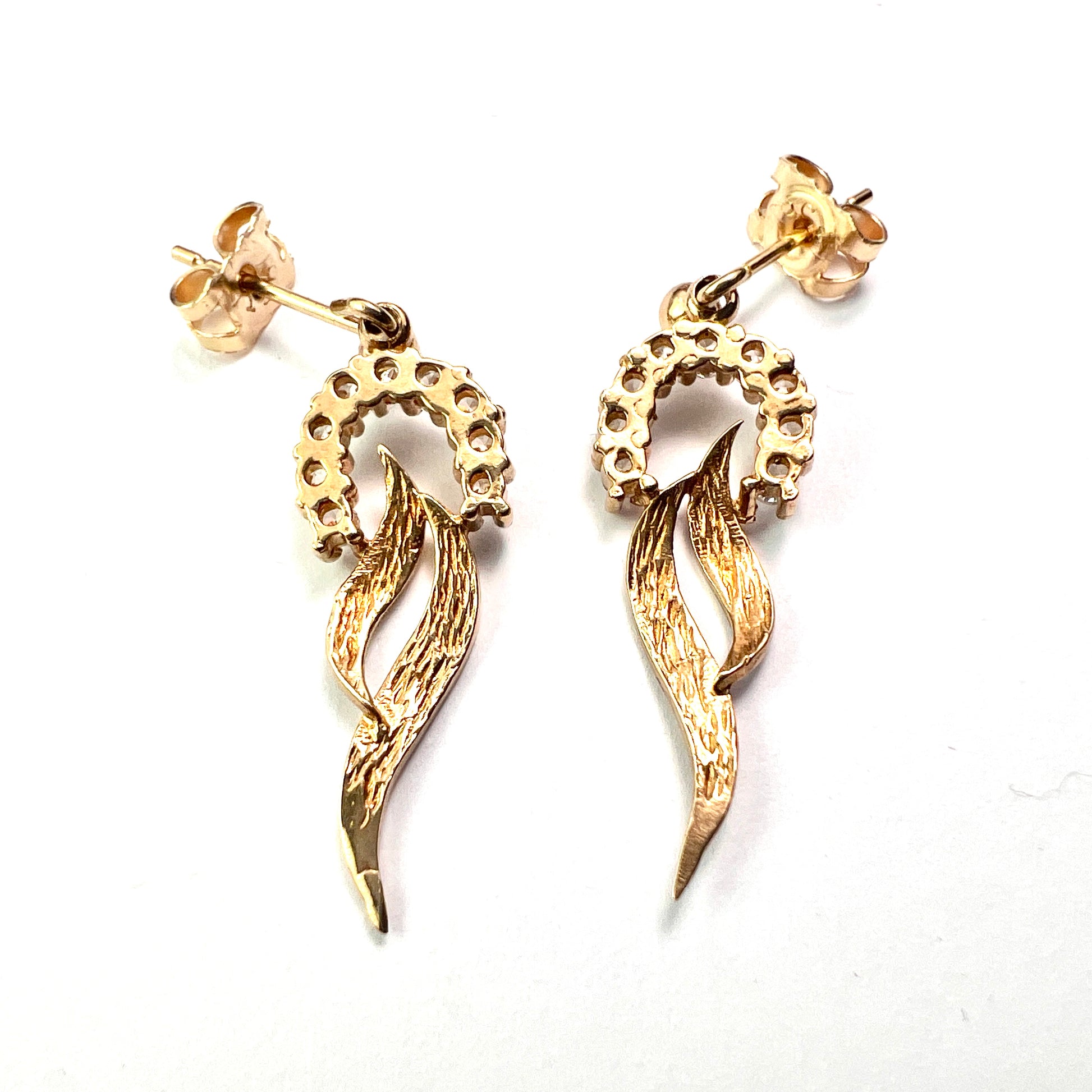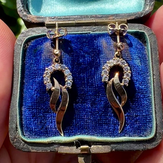 Vintage earrings in solid nine-carat gold with sinuous flame-like curves flowing from sparkling cubic zirconia-set horseshoes.