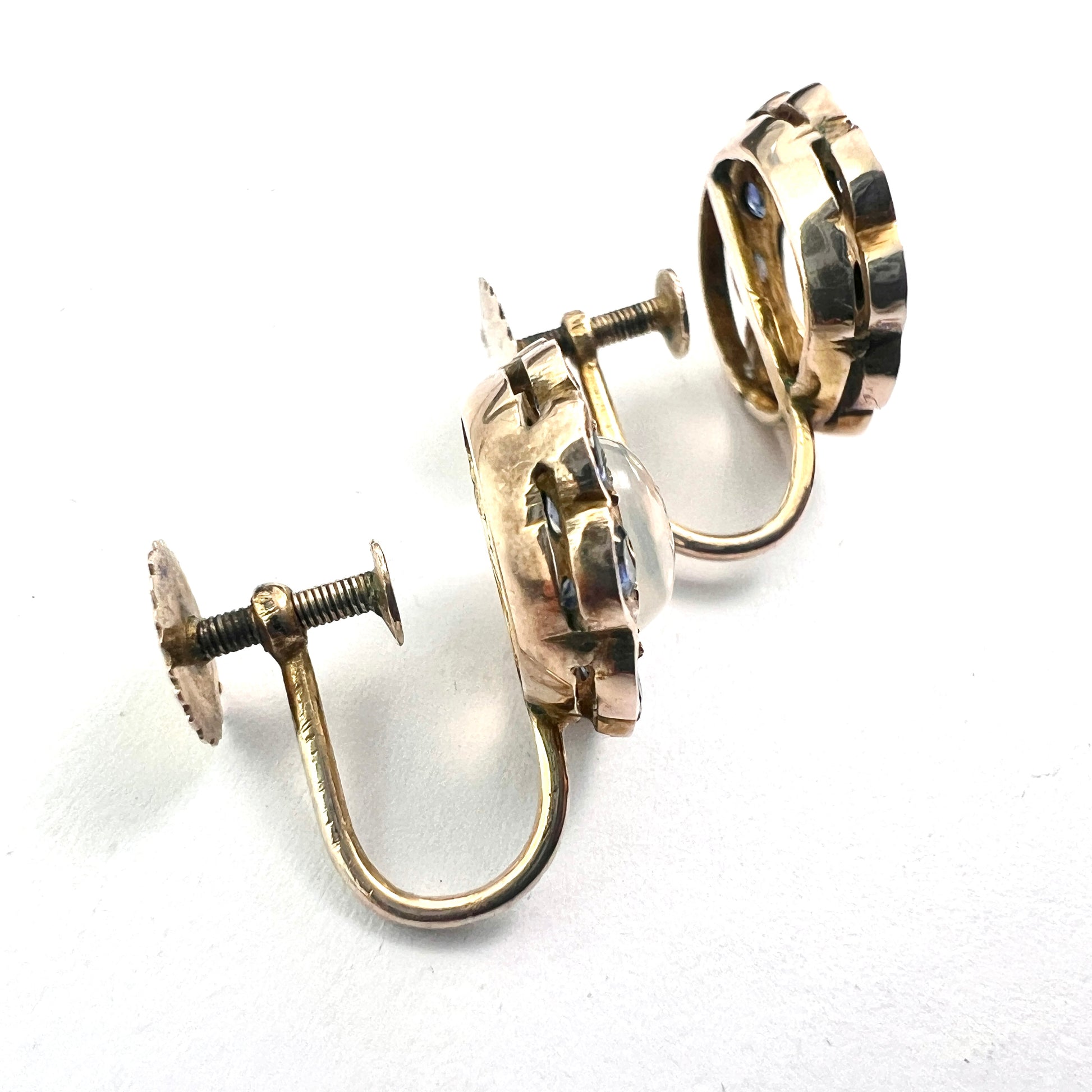 Antique gold screwback earrings with beautiful luminous moonstones framed in a halo of cornflower blue sapphires.